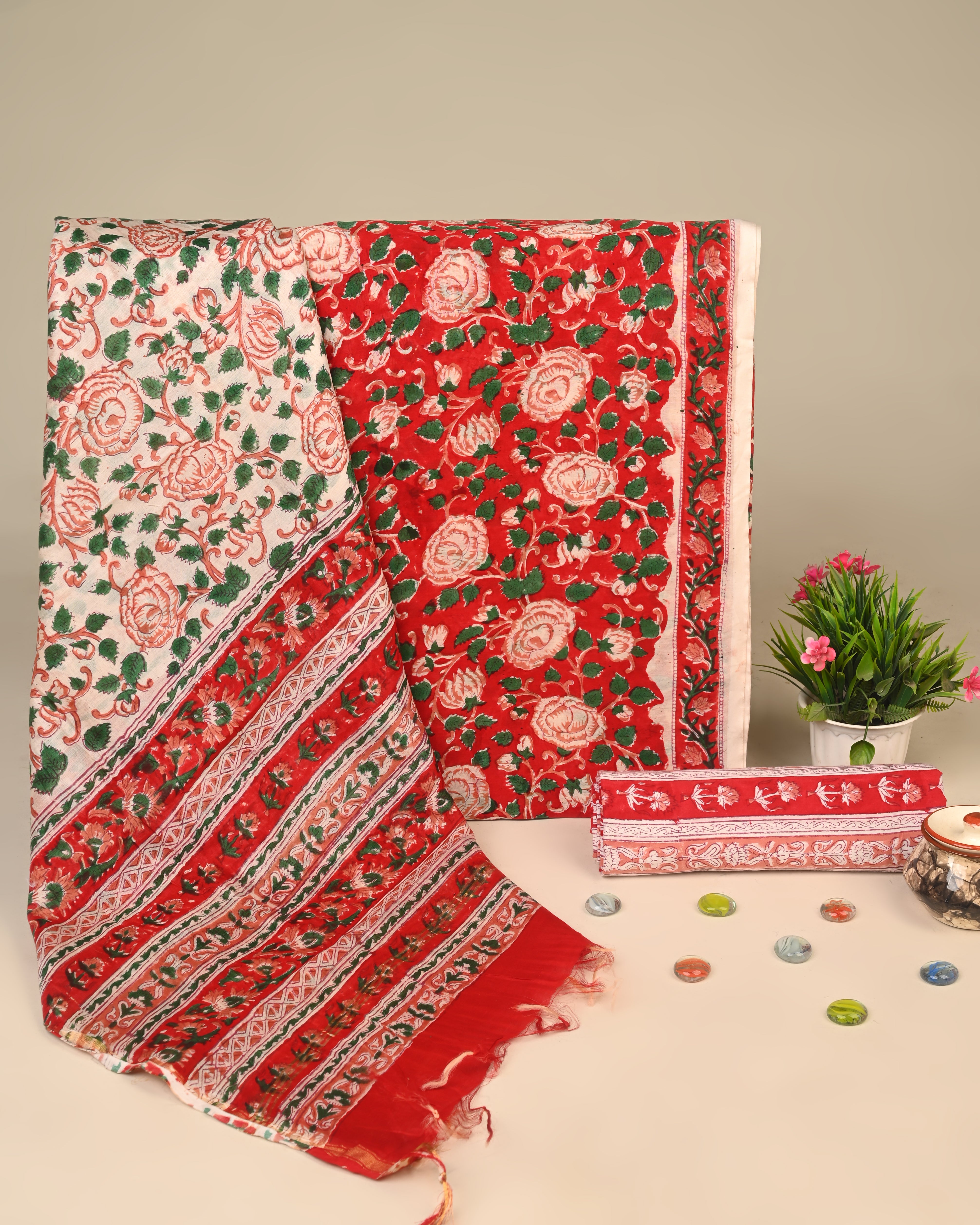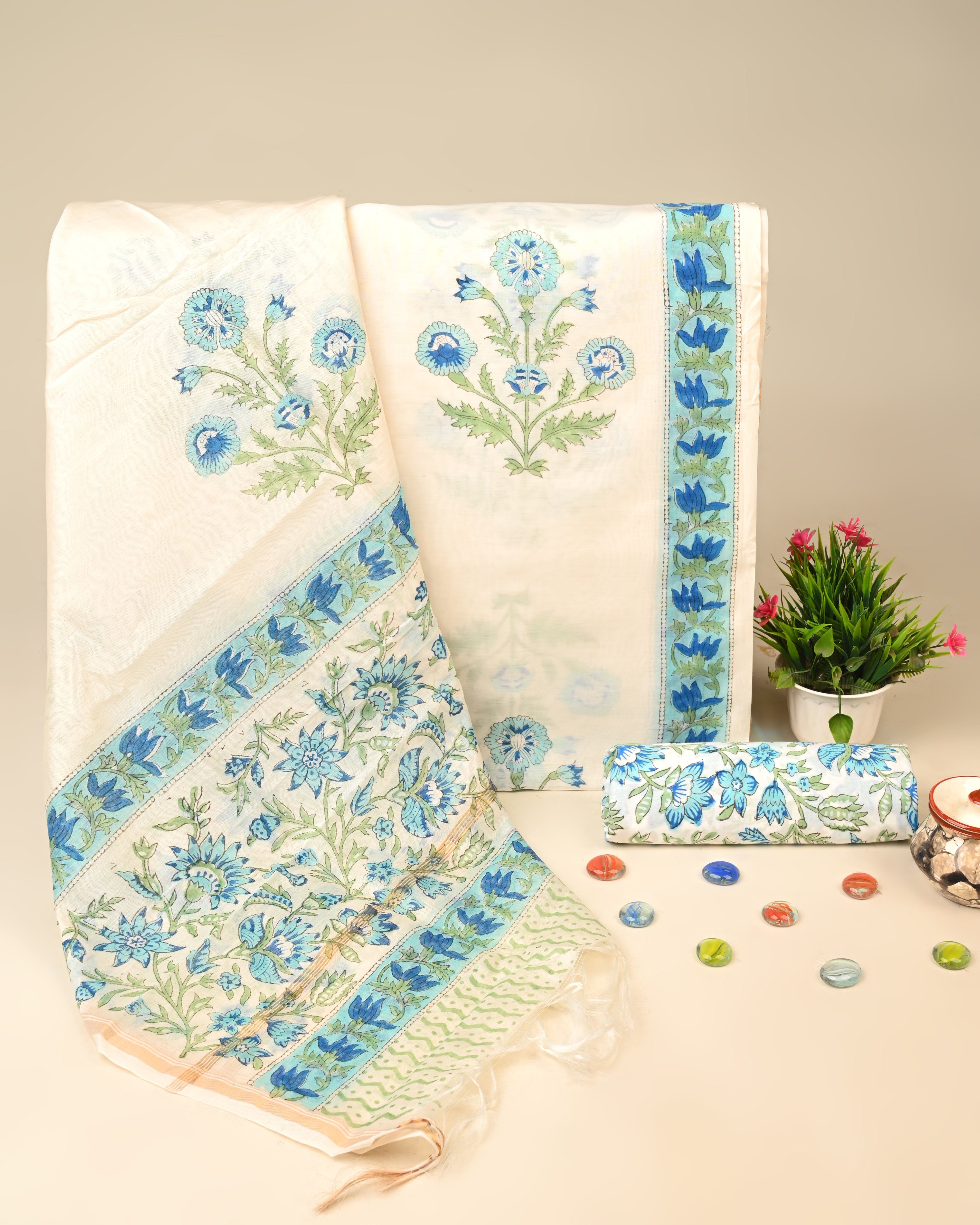 Each fabric is carefully selected and adorned with authentic hand block prints, celebrating the artistry of Indian textile heritage.